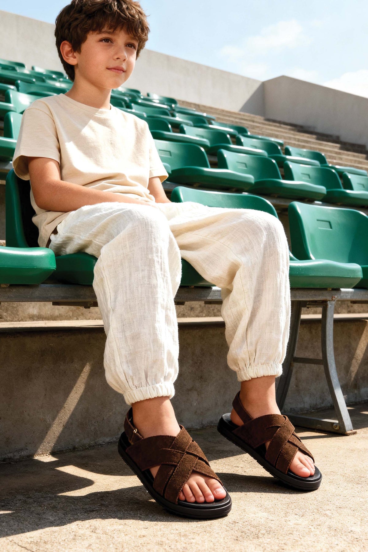 These stylish brown criss-cross sandals offer a snug fit and flexible comfort, perfect for active little feet on warm days.
