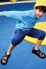 Made from premium leather these sandals are designed for both style and support. These dual-tone kids’ sandals in black and blue have secure straps for better grip and a side buckle for easy fastening. Ideal for little explorers on the go.