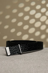 Uplift your look with this smart black belt, featuring an exotic ostrich-textured cow leather finish.