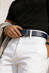 Make a statement with this refined navy blue crocodile-printed belt, paired with a signature LOGO COLLECTION metal buckle for a modern finish.