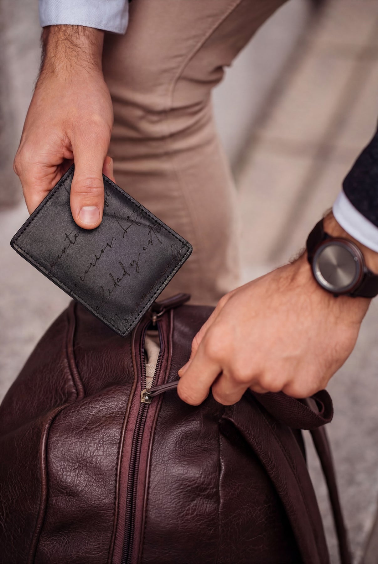 - Cow crust leather with laser-engraved detailing