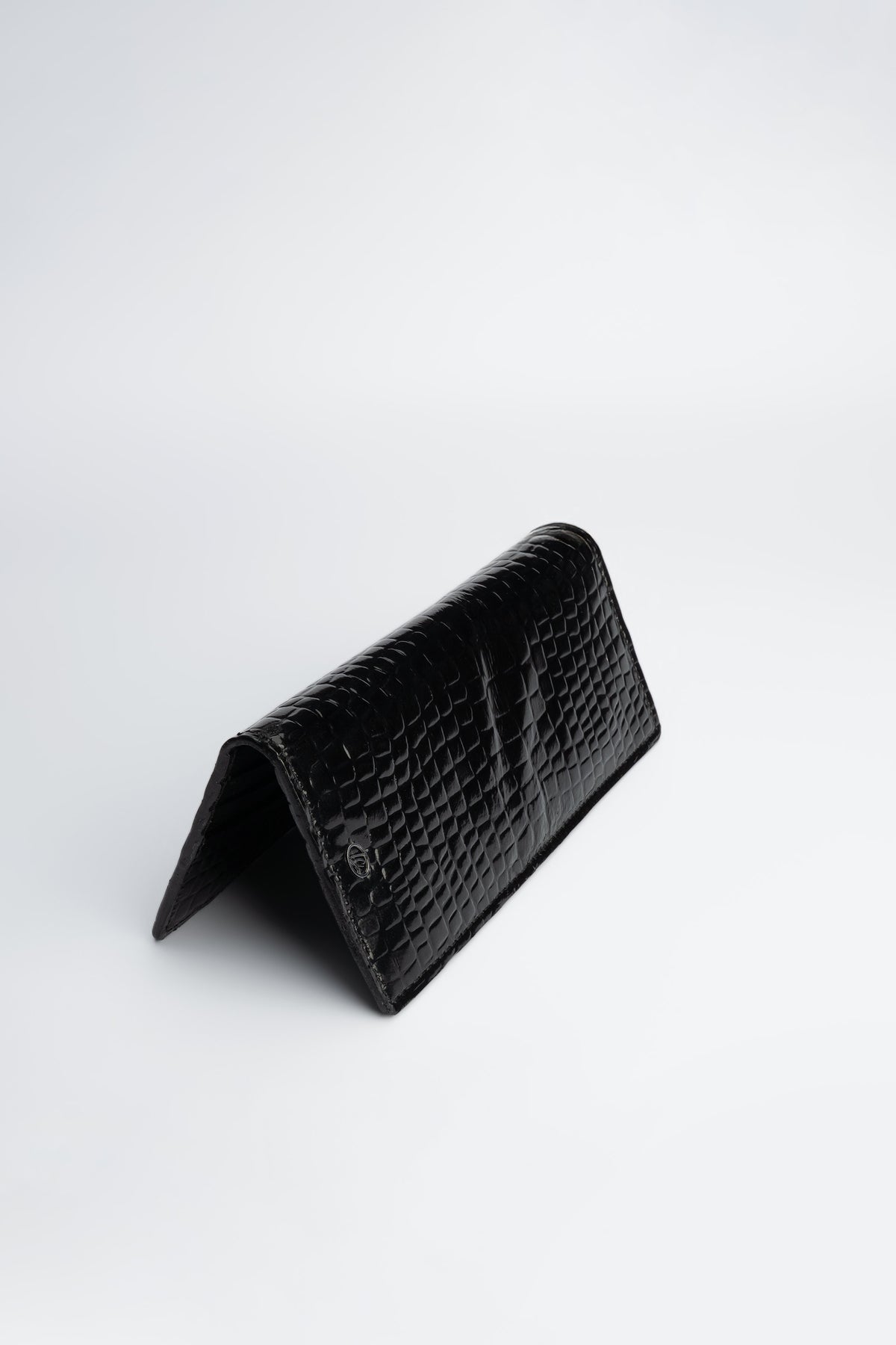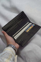 This black long note wallet is made from crocodile-textured patent sheep leather. It provides better security with RFID protection for everyday confidence.