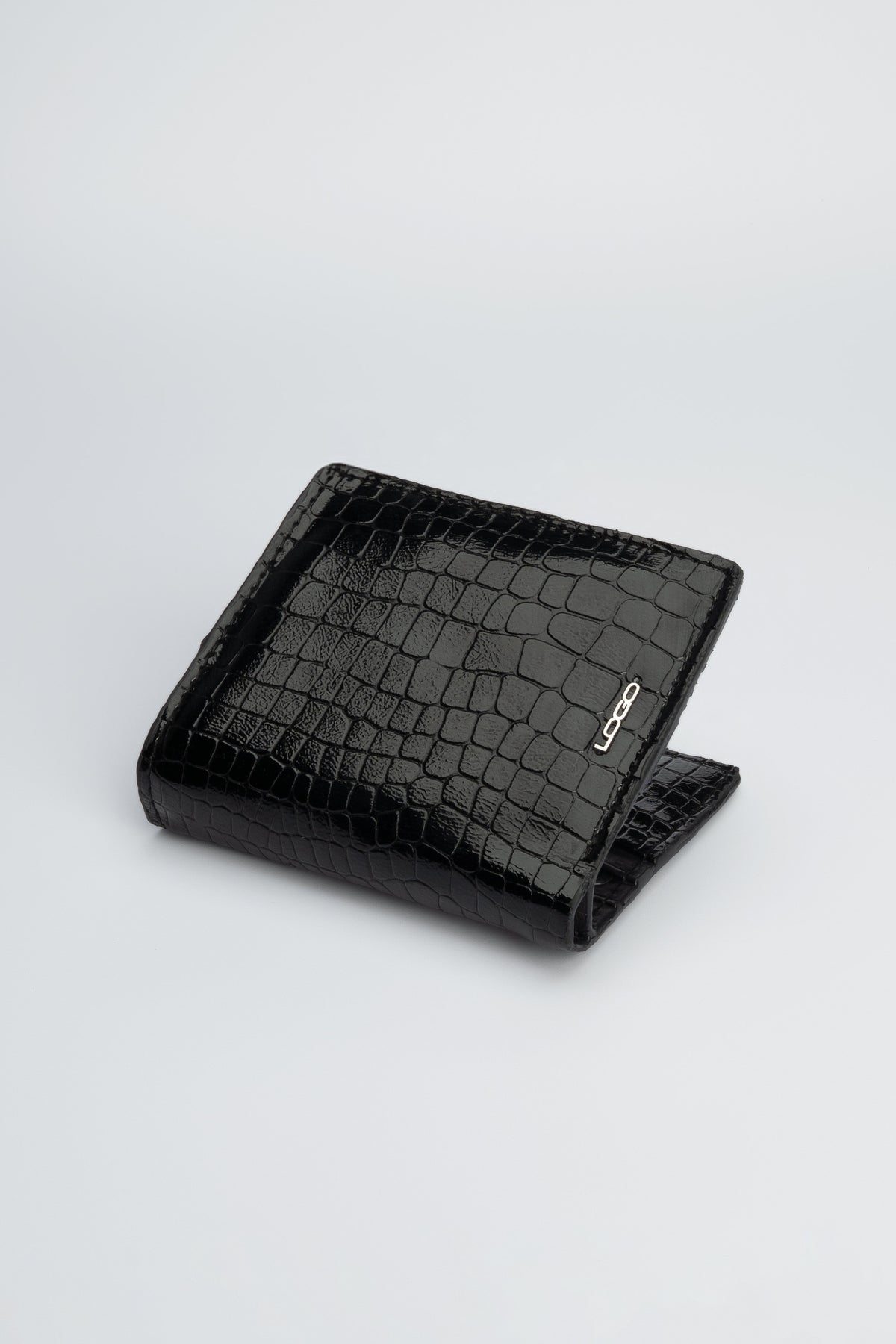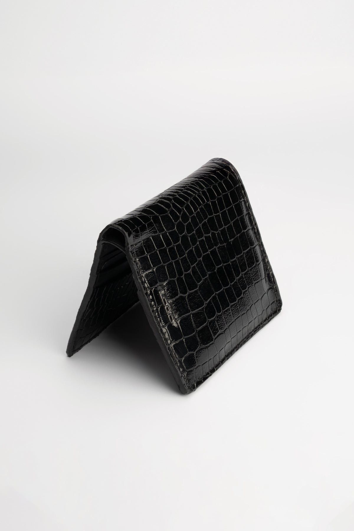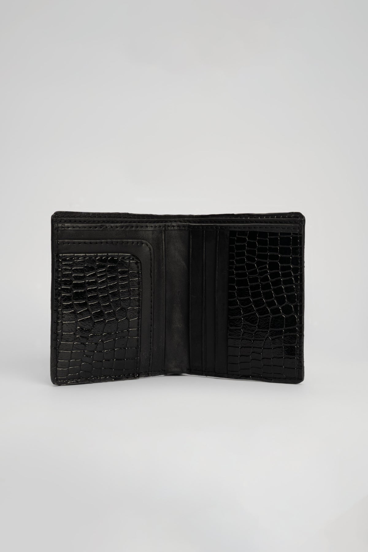 A premium everyday essential, this black wallet combines crocodile-textured goat patent leather on the outside with soft cow aniline leather inside for a refined finish.