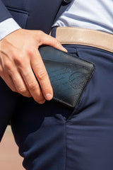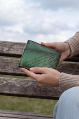 This fiery wallet features a rich, deep electric Green hue that gracefully darkens at the edges, adding. It is made from high-quality leather and it offers ample space for your essentials with timeless charm.
