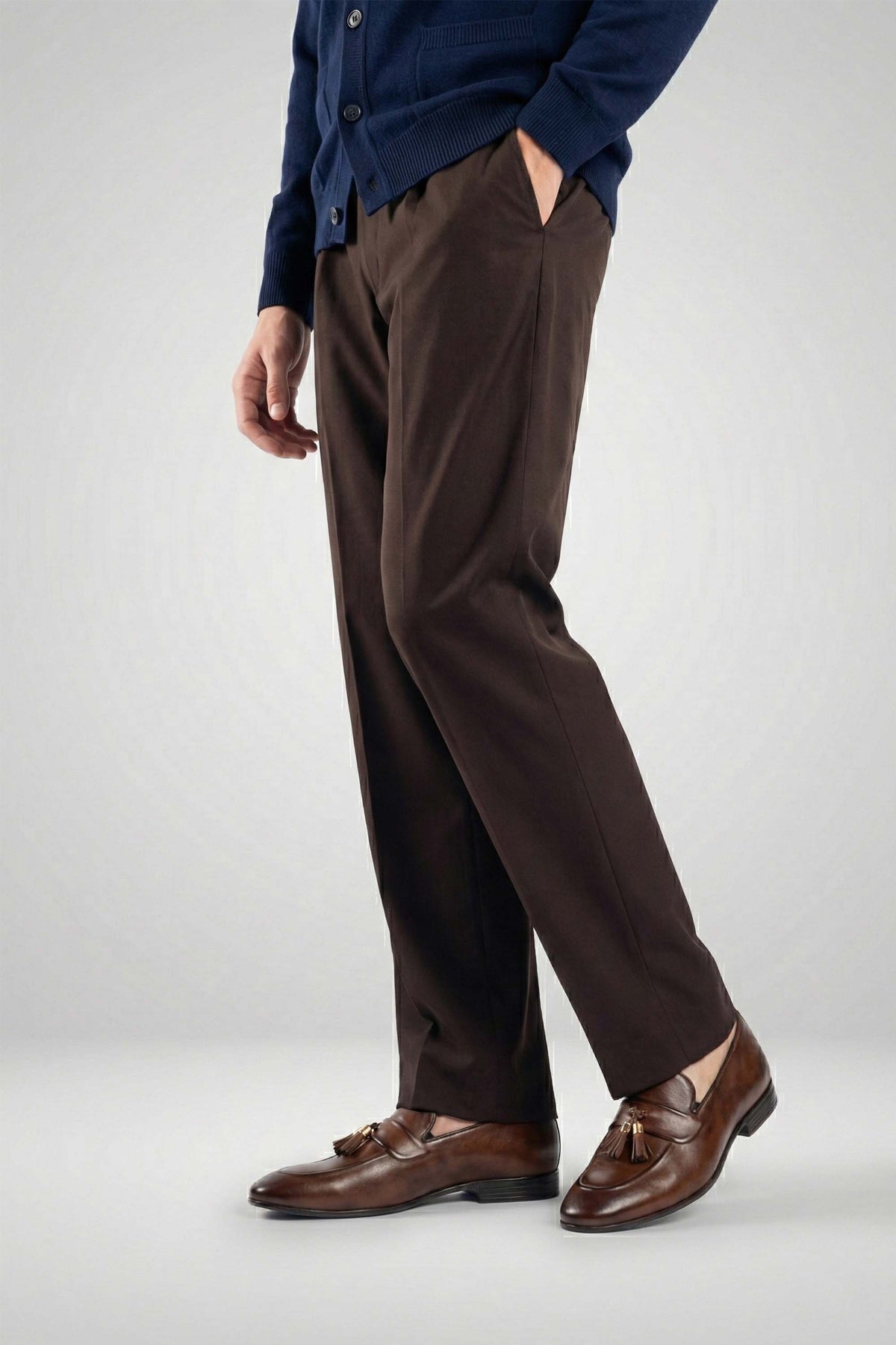 This formal wear features a rich brown gradient that adds depth and character. Adorned with tasteful tassel embellishments, it offers a perfect blend of classic style and contemporary flair.