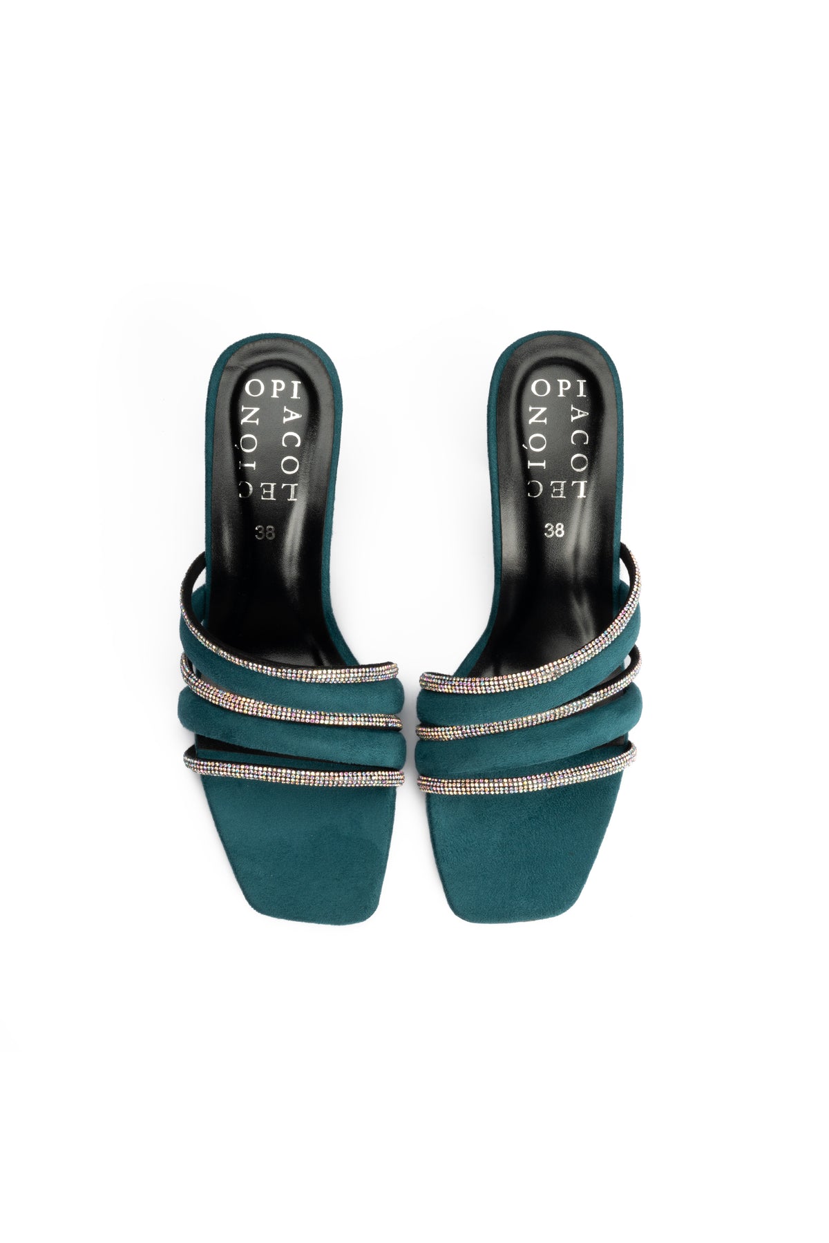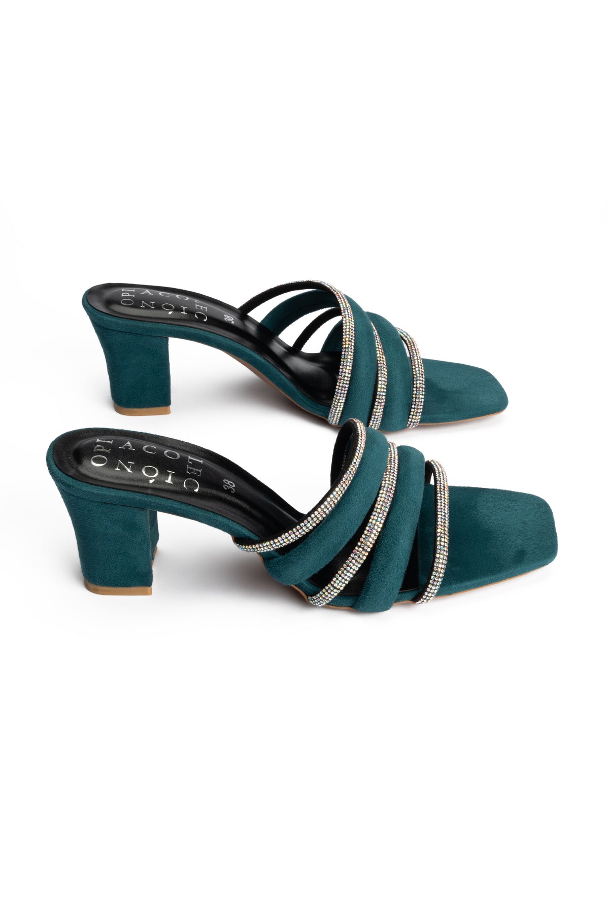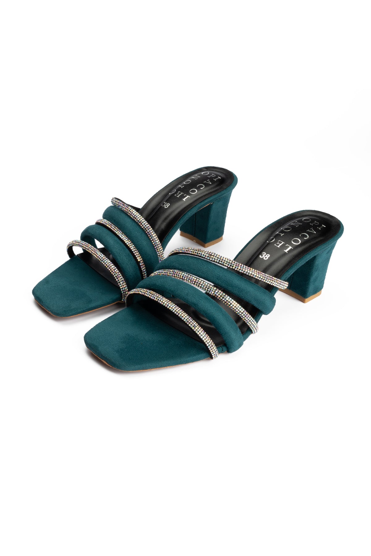 These elegant green heel slippers combine vegan leather with a fancy mesh rope upper, creating a stylish and modern look. They are designed for comfort and stability which is ideal for festive wear and evening outings.