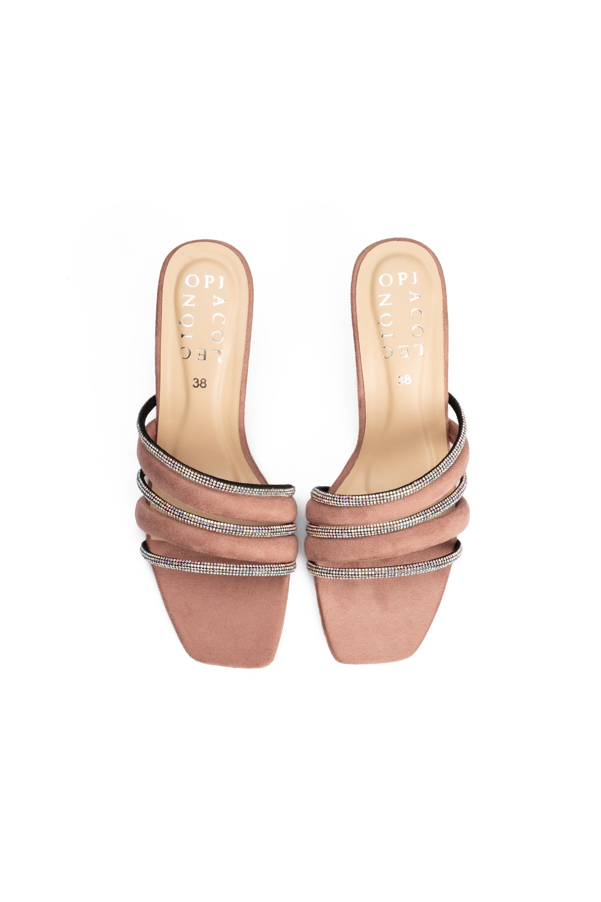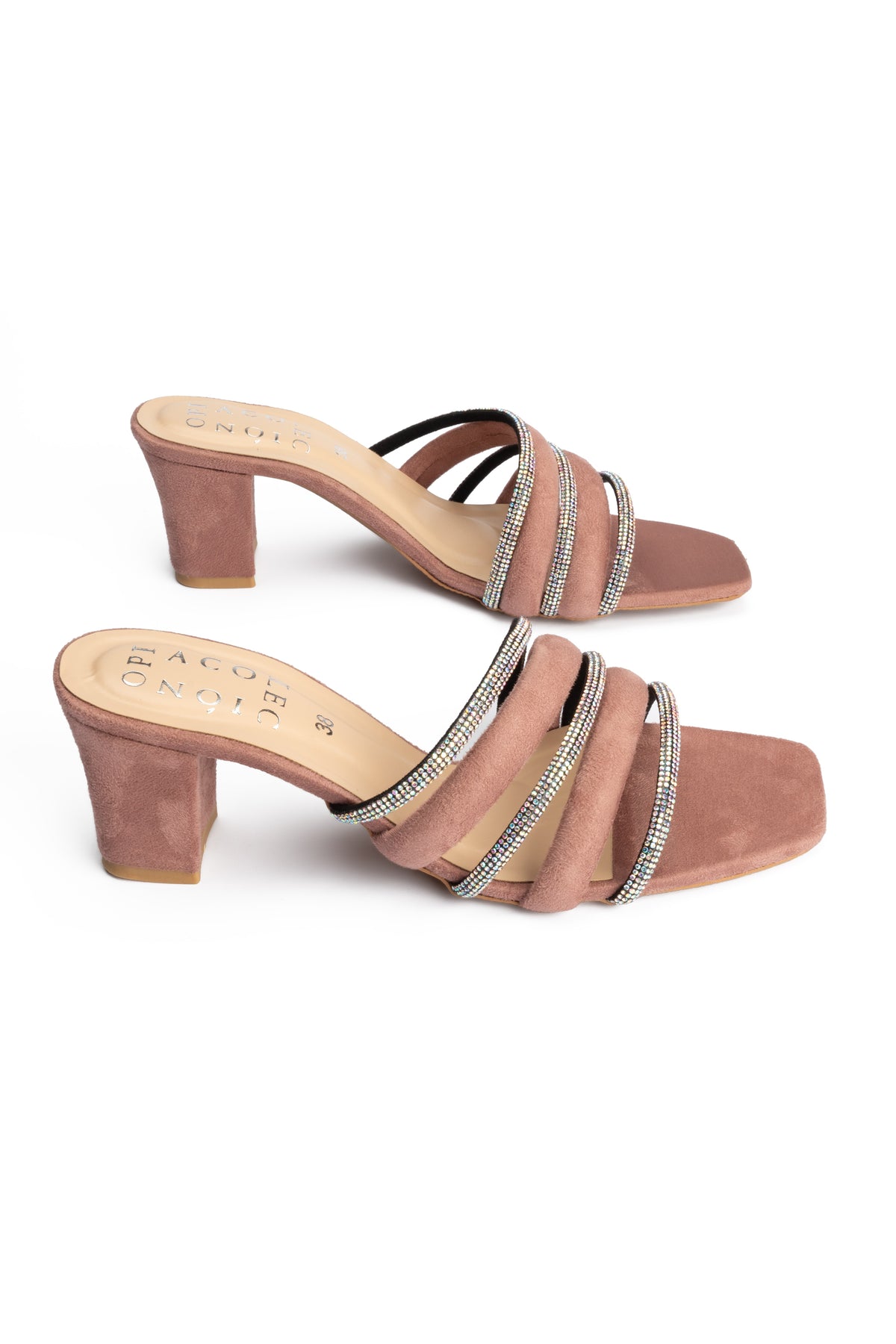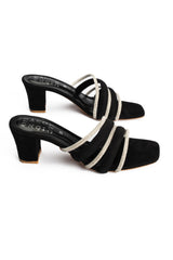 These elegant peach heel slippers combine vegan leather with a fancy mesh rope upper, creating a stylish and modern look. They are designed for comfort and stability which is ideal for festive wear and evening outings.