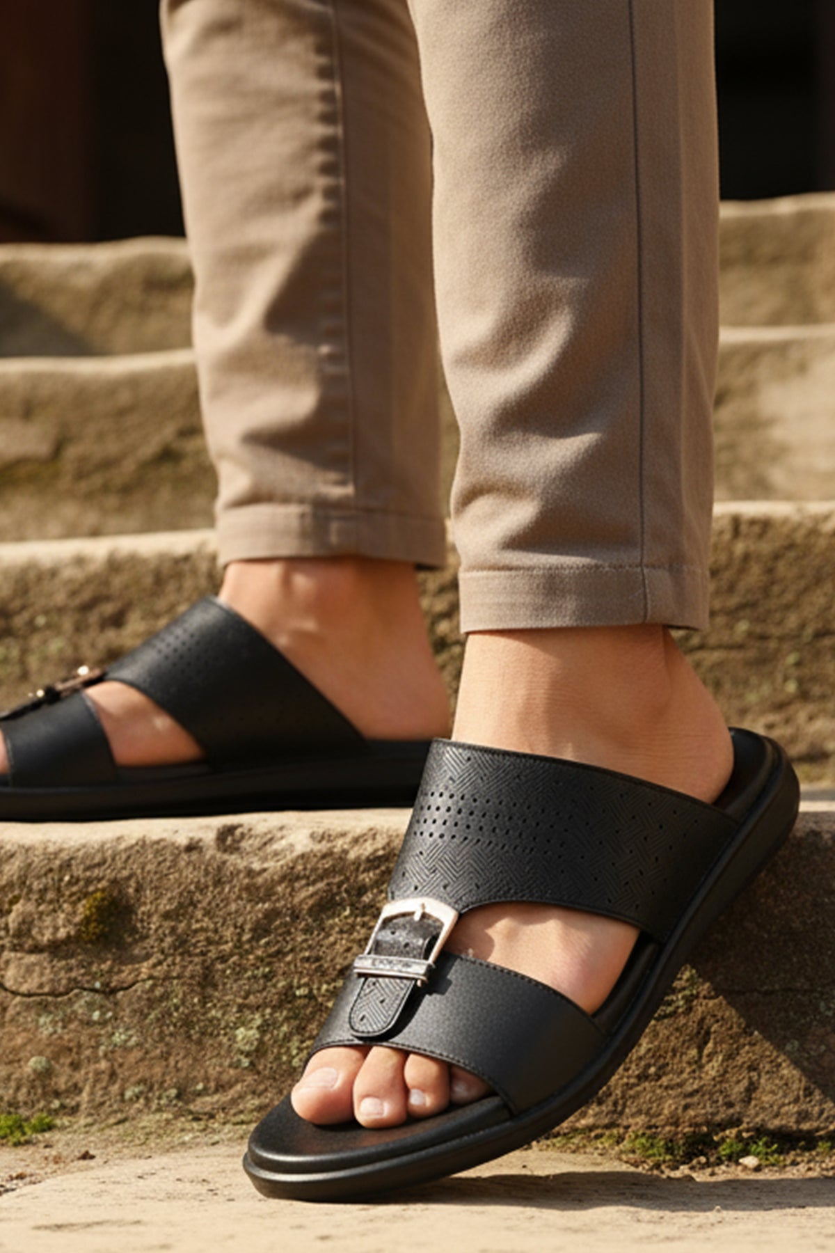 Black cow leather slippers designed with a strong silhouette and a comfortable build.