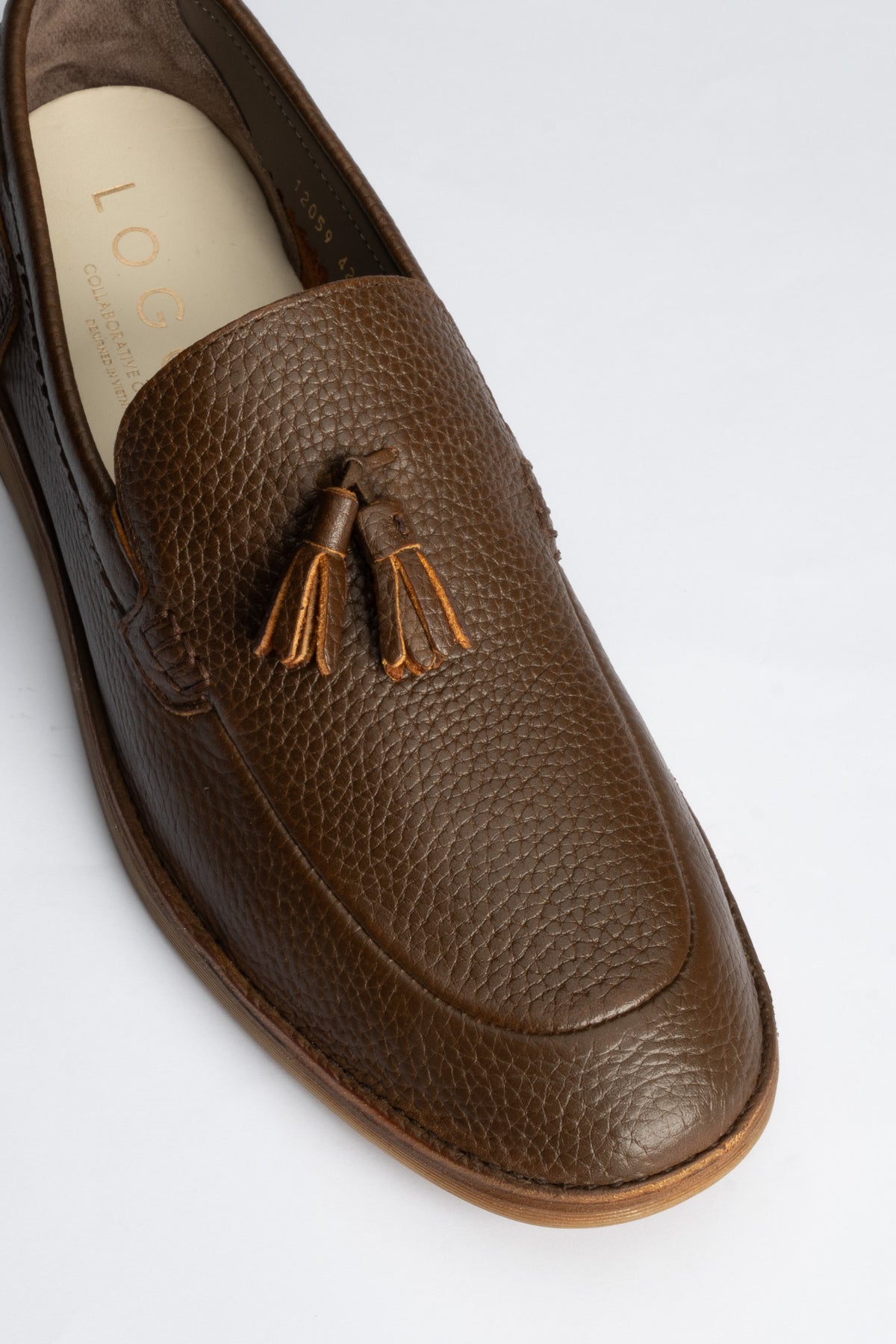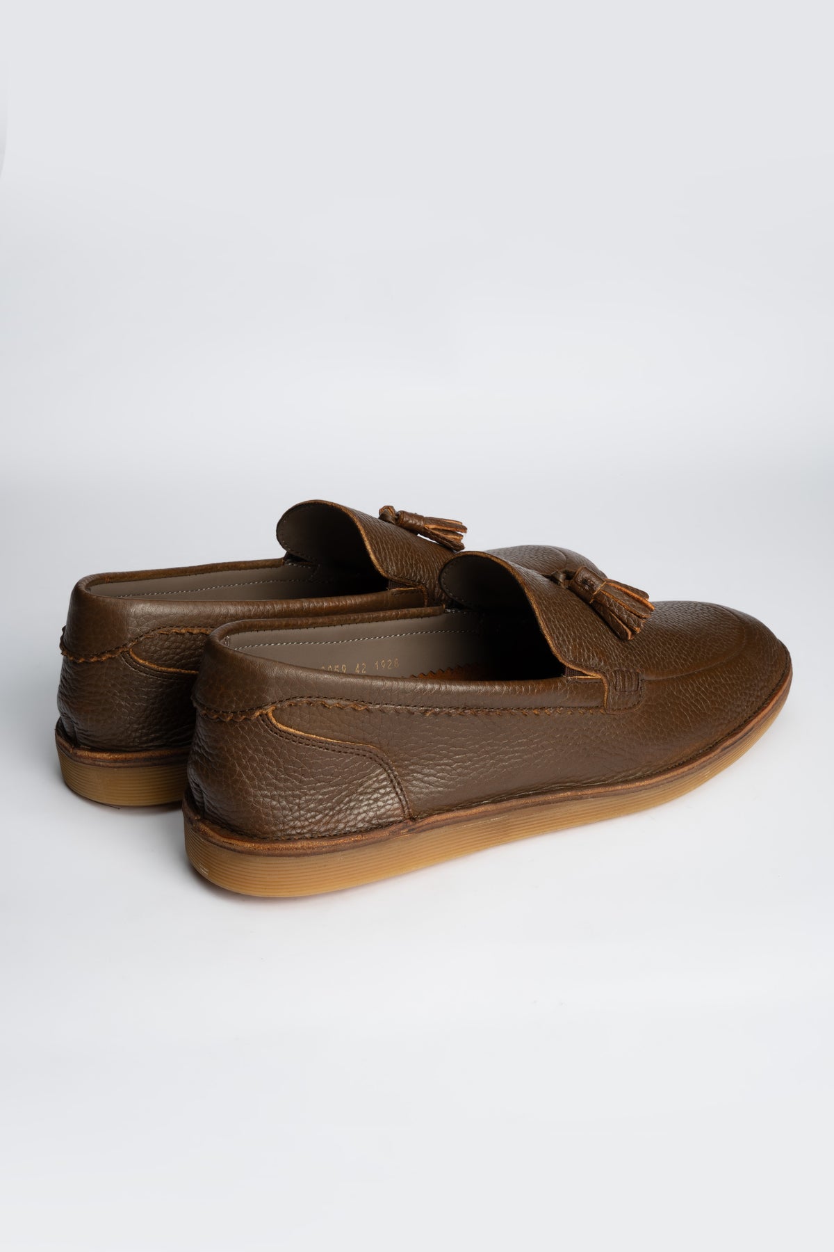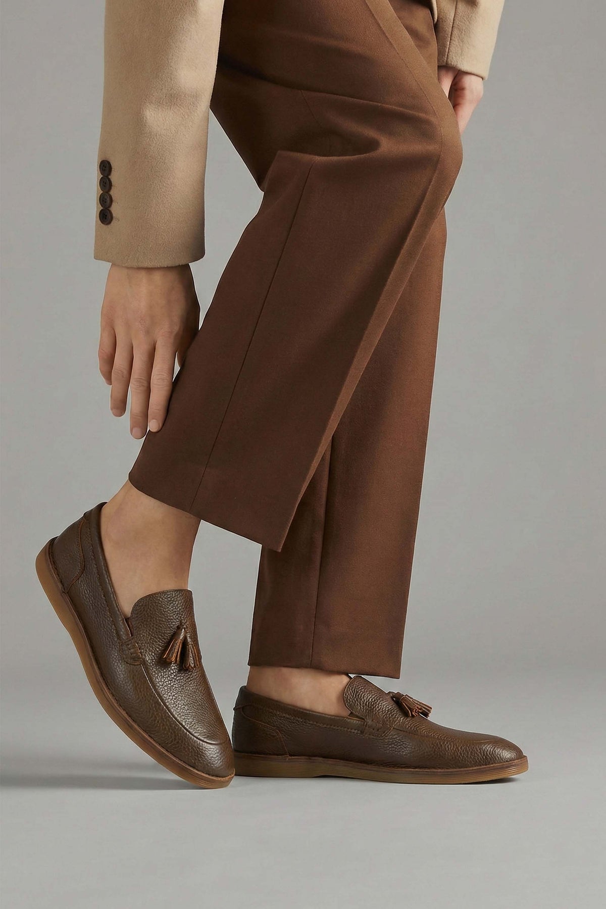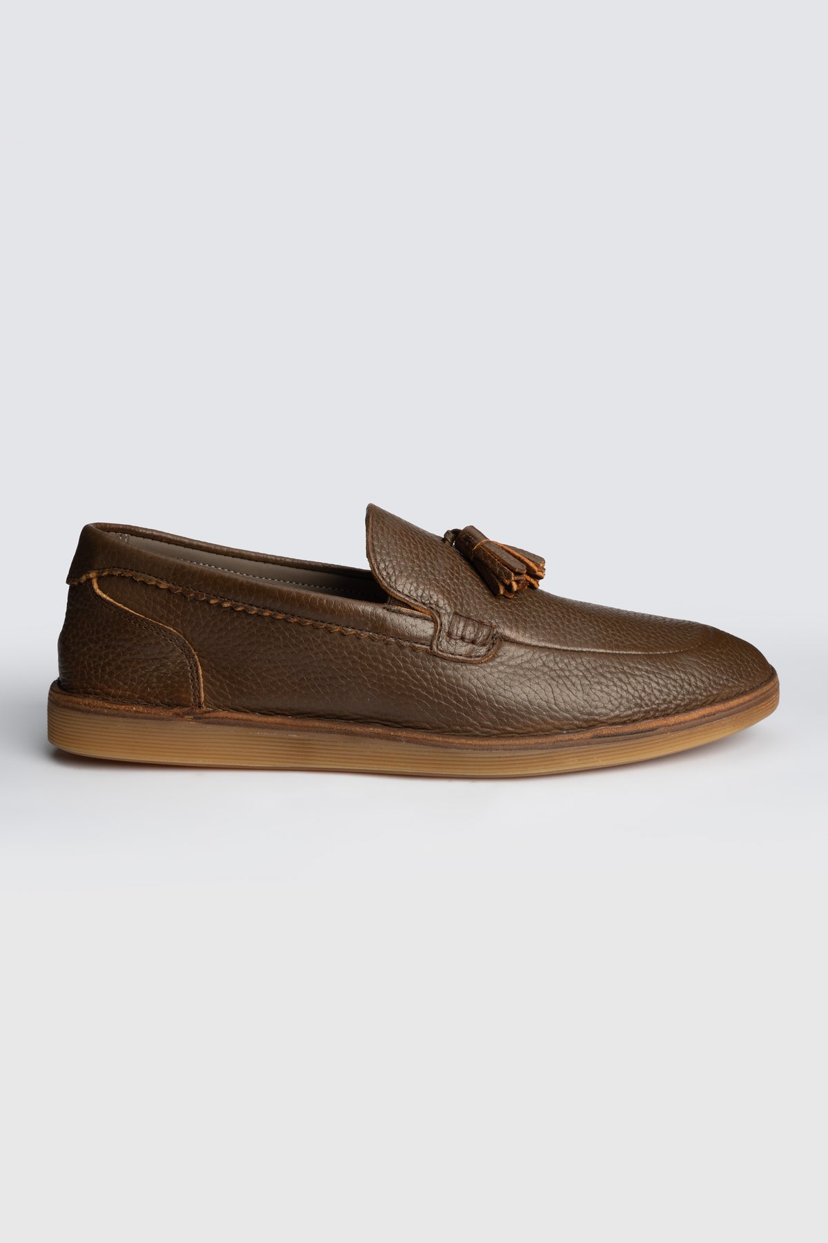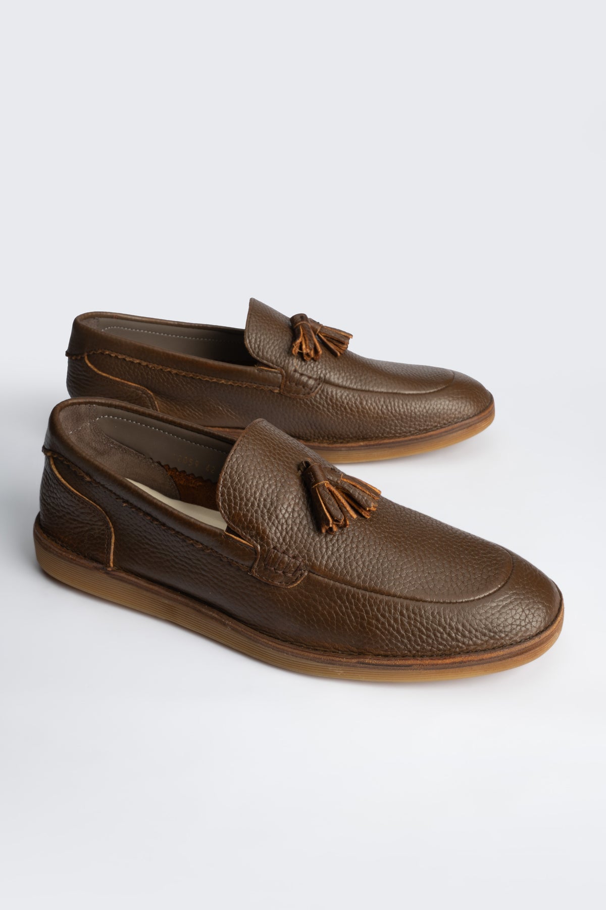 These brown men’s footwear design features a sponge milled feel leather upper, offering a soft texture and modern appearance. They are engineered for flexibility and comfort to ensure effortless wear throughout the day.