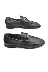 Black loafers featuring a strong textured finish, defined by a metallic buckle