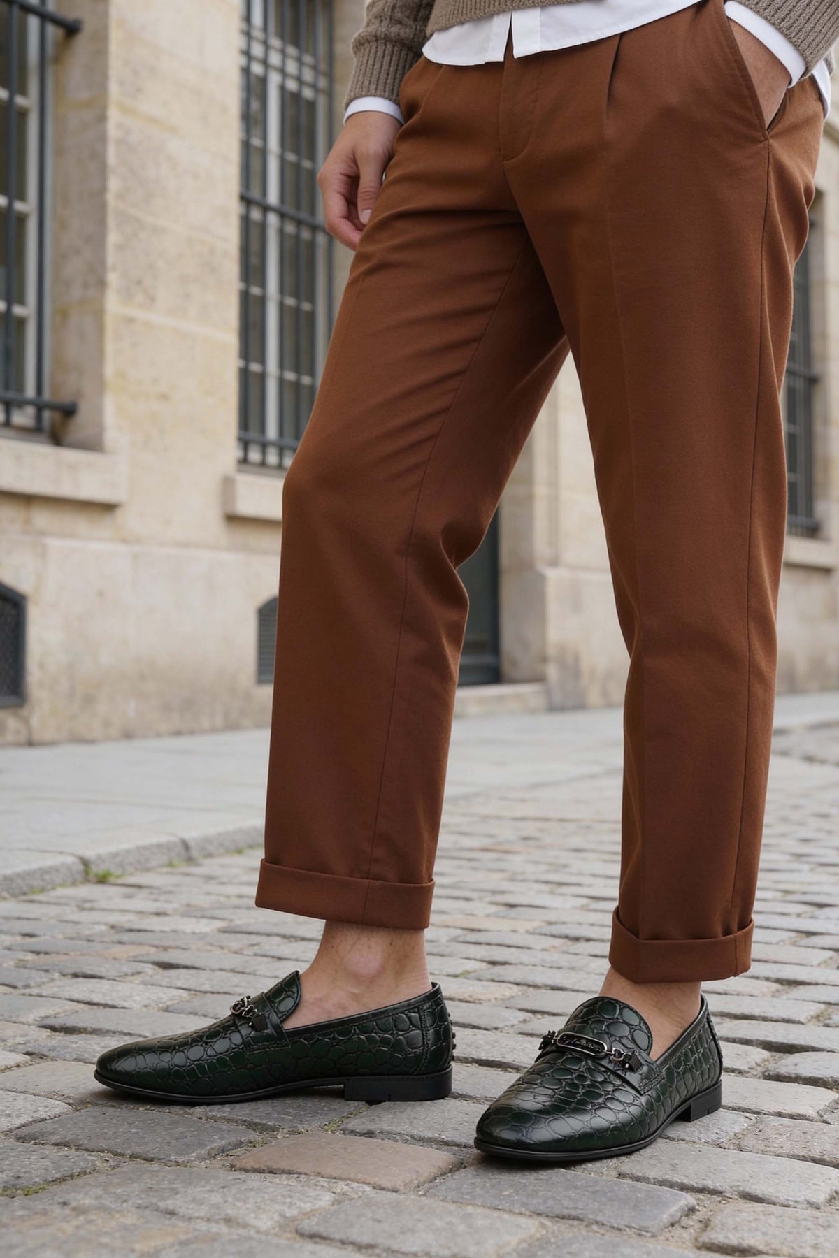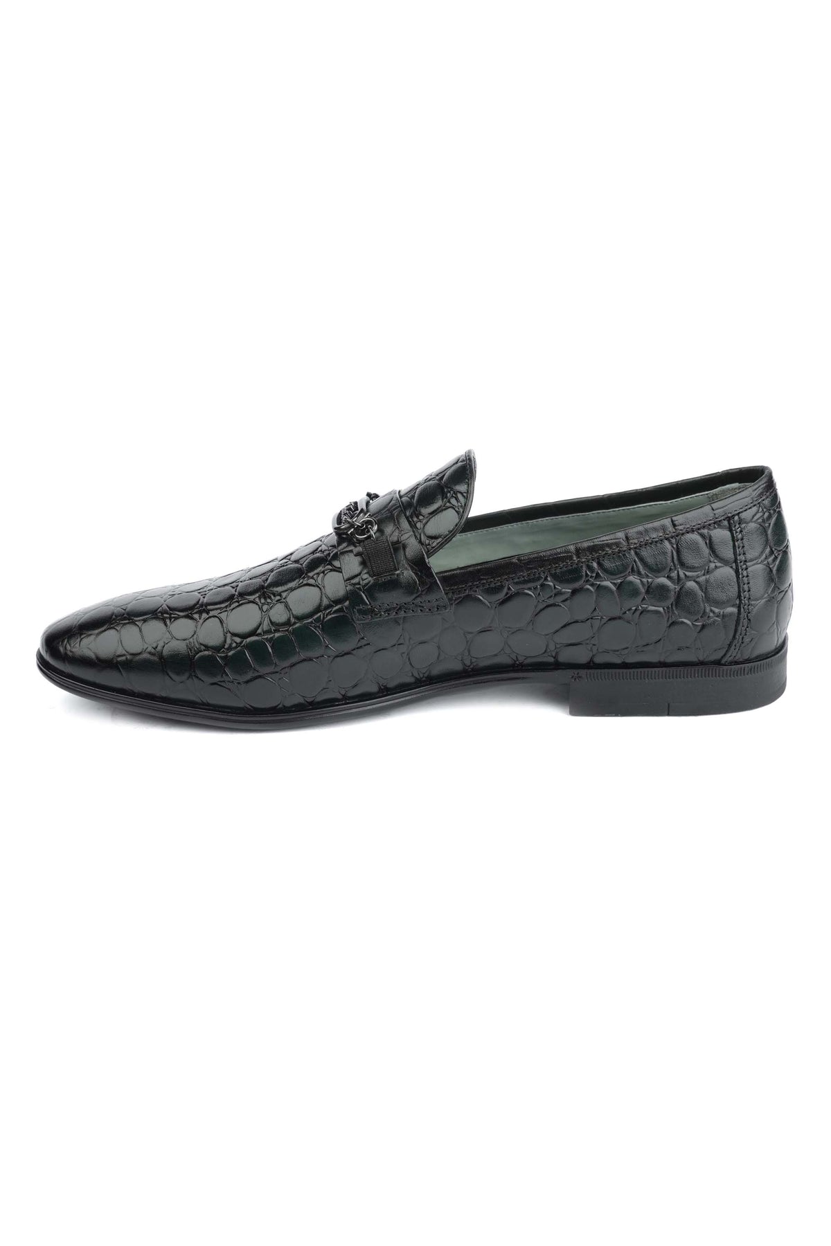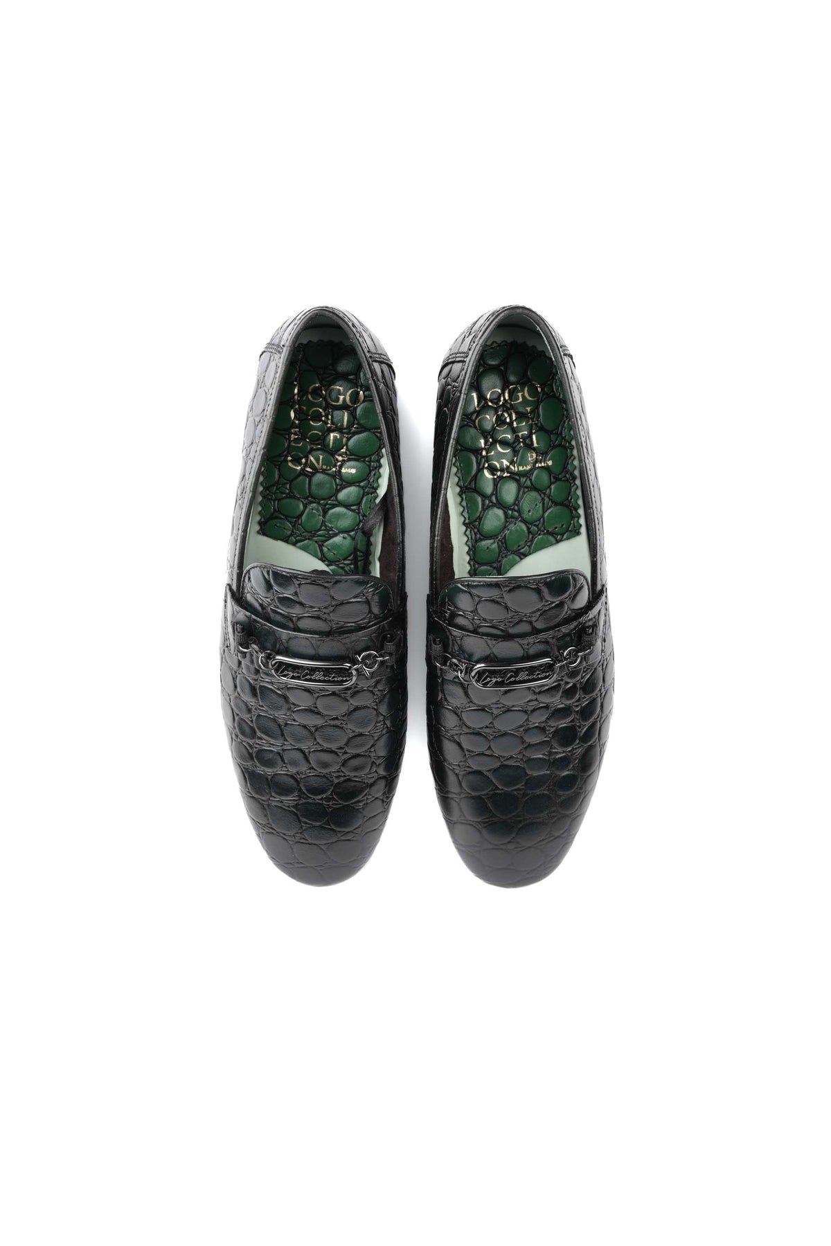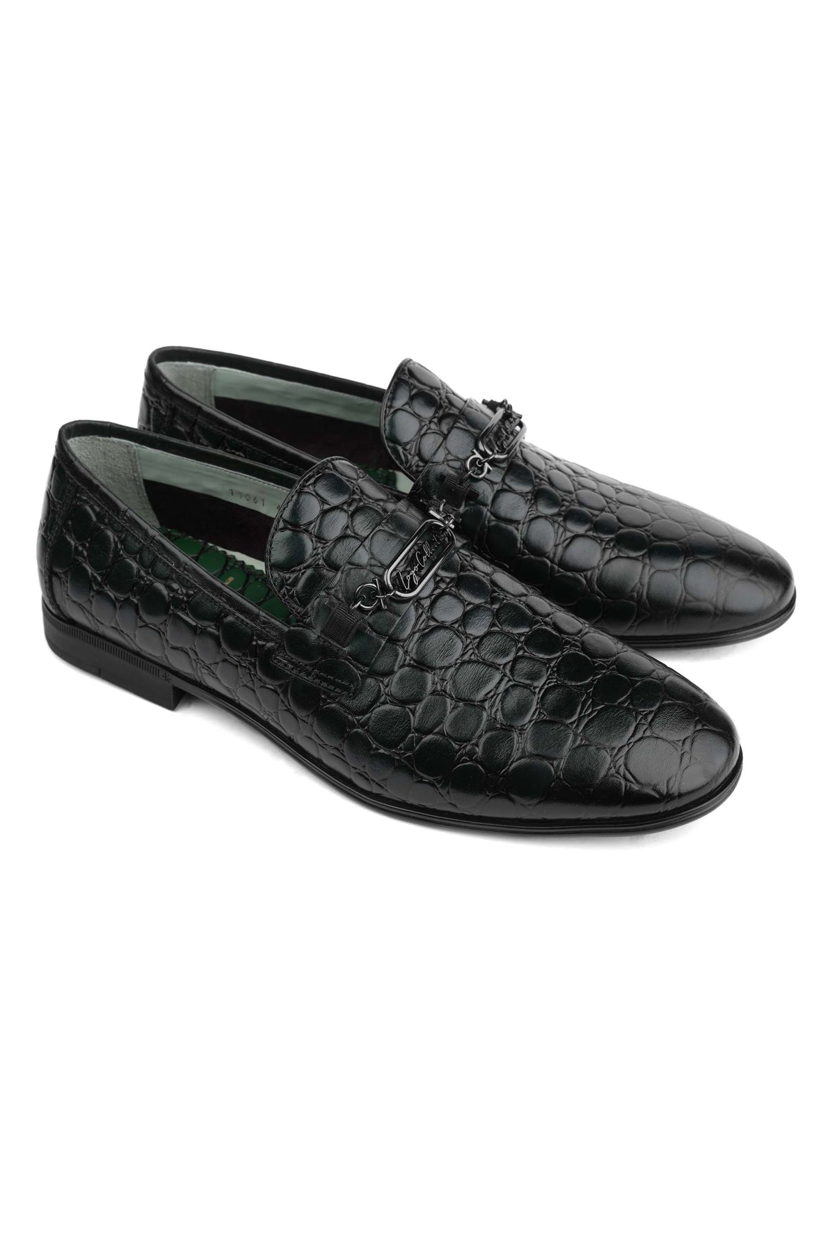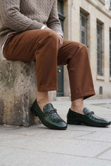 Introducing our green leather loafers, a statement of sophisticated luxury. These shoes feature a rich, textured leather that captivates with its deep, vibrant hue. The design is elevated by a striking silver-toned brooch, an emblem of refined taste that adds a touch of modern elegance to a timeless classic. It's more than a shoe—it's an expression of confident style.