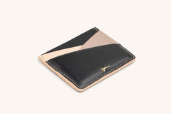 Black leather card holder with beige and cream top pockets, featuring a gold logo buckle in the center.