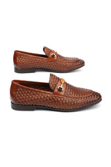 These brown loafers feature a finely woven leather upper accented with a golden buckle on the toe. It offers a blend of classic charm and contemporary detail.