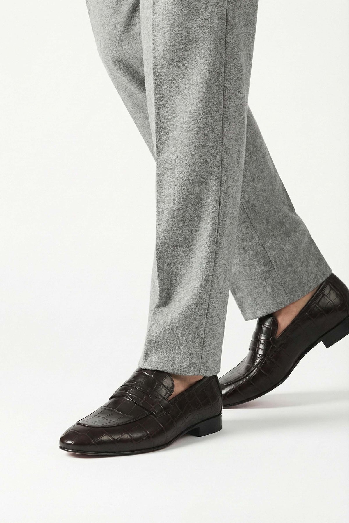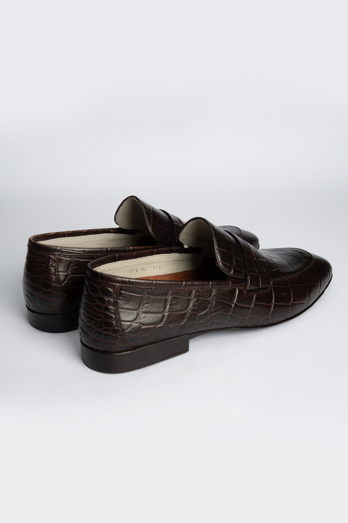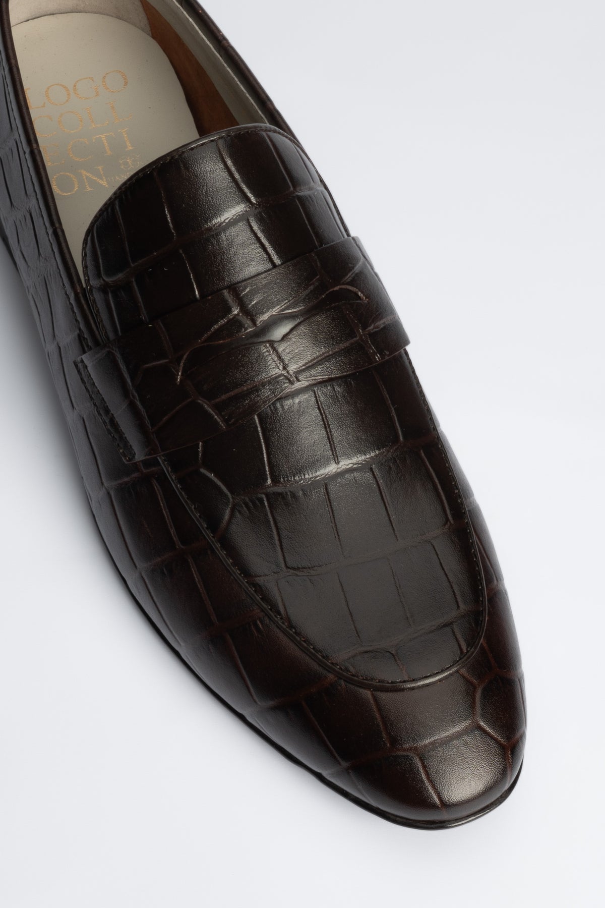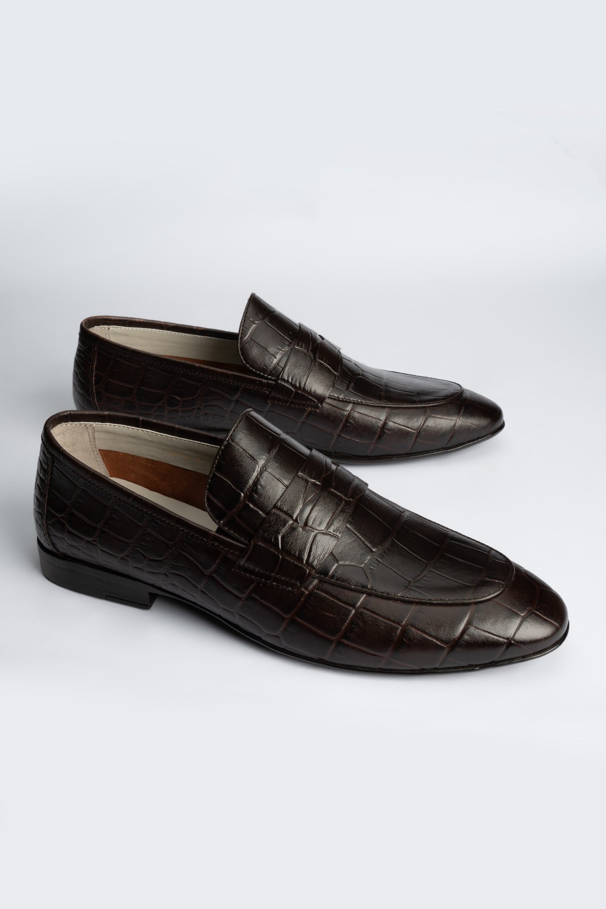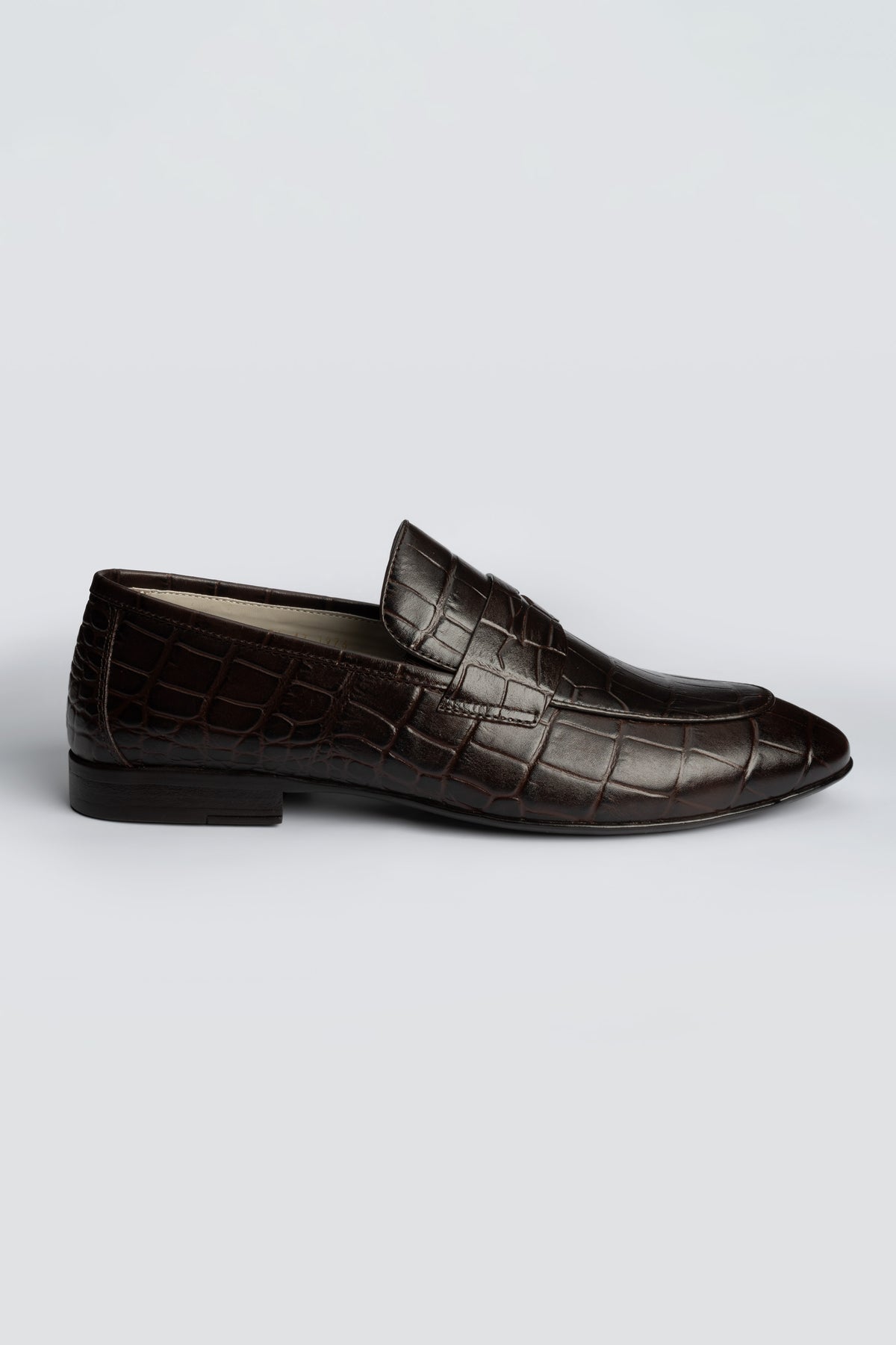 - Crocodile texture leather upper in rich brown-choco hue.