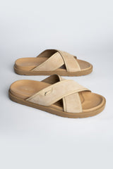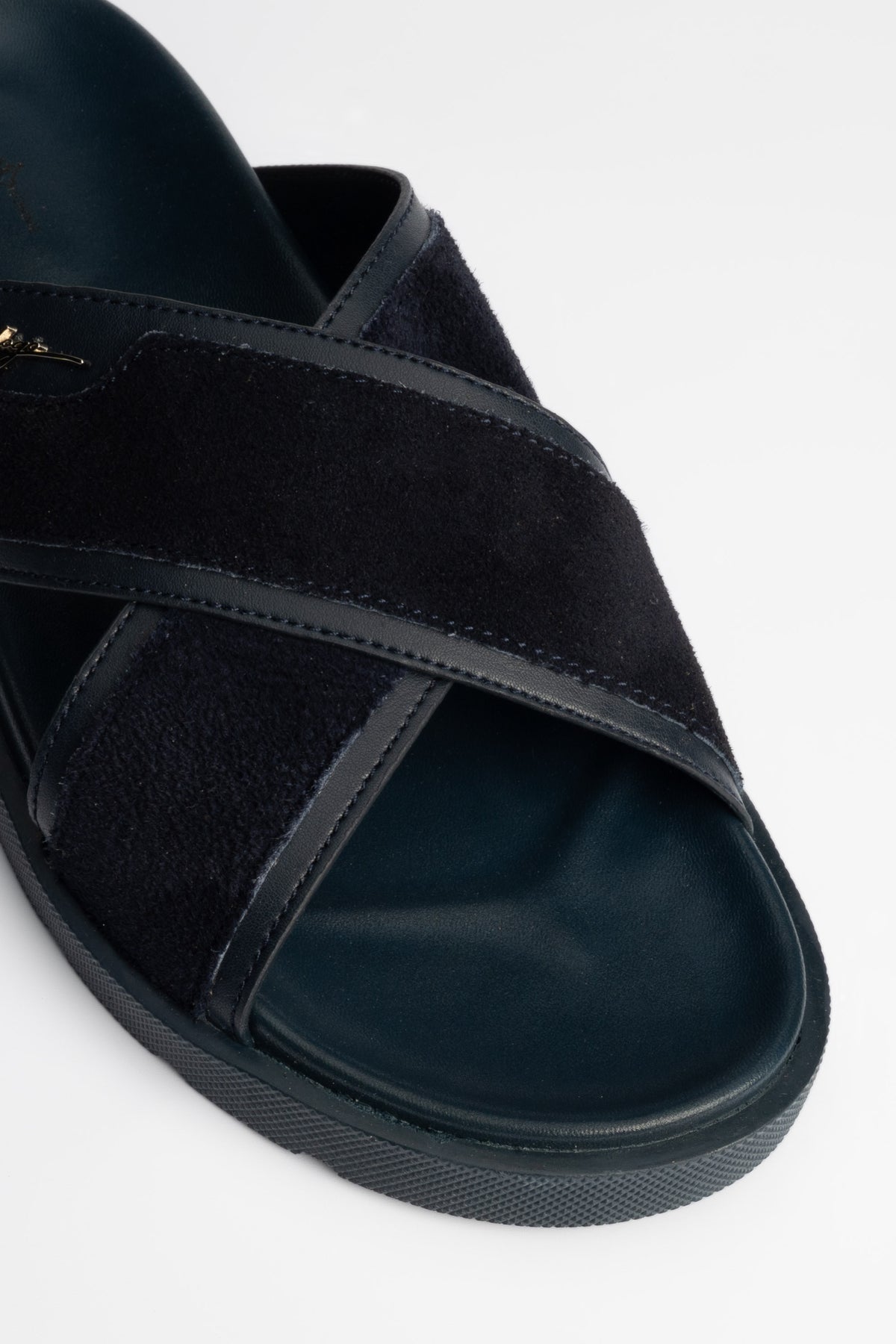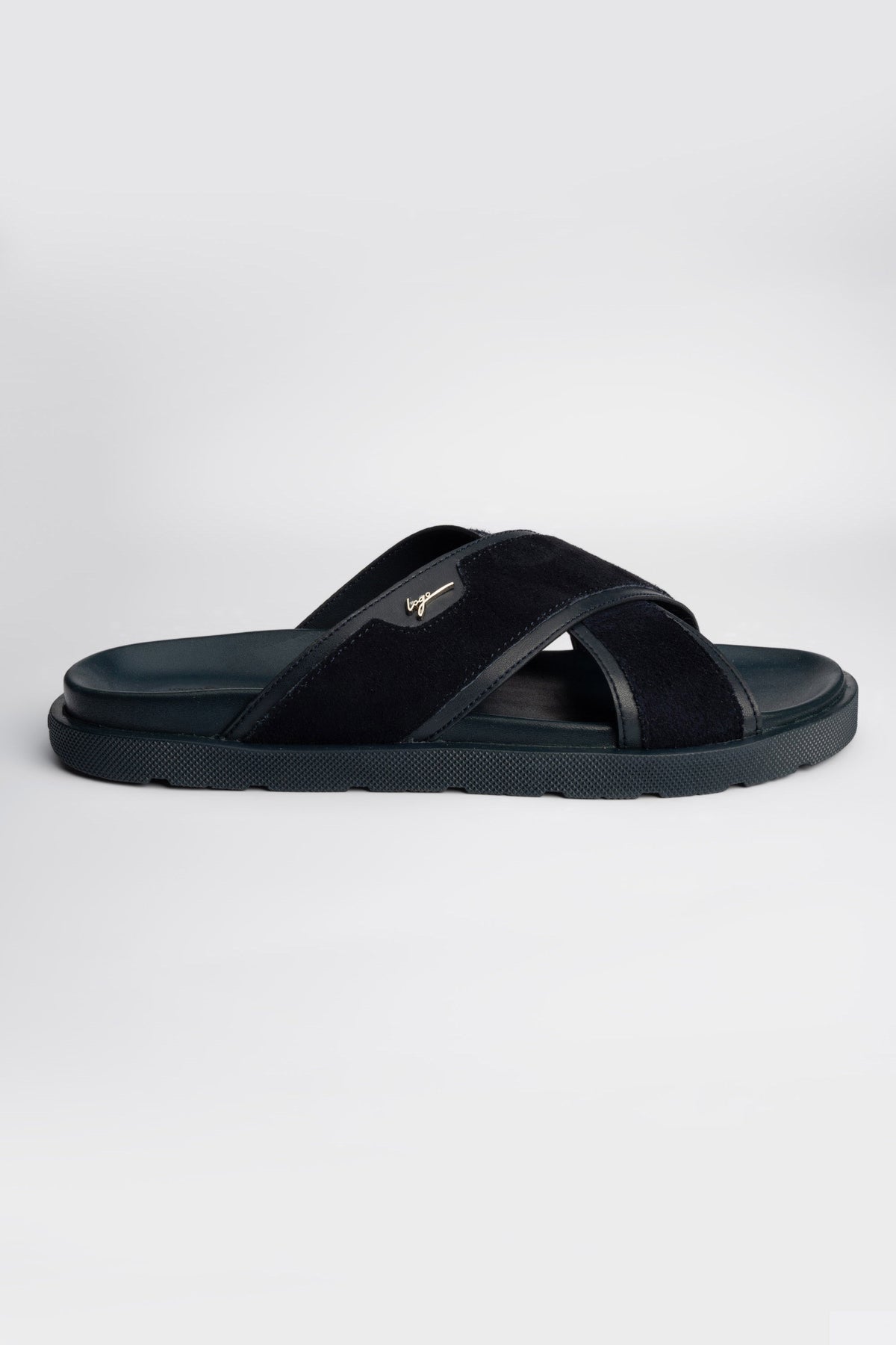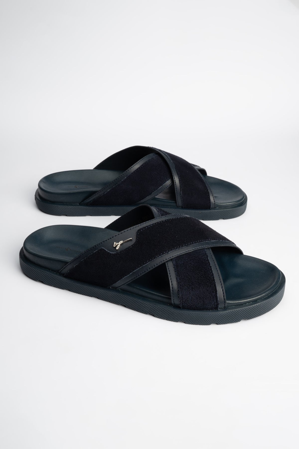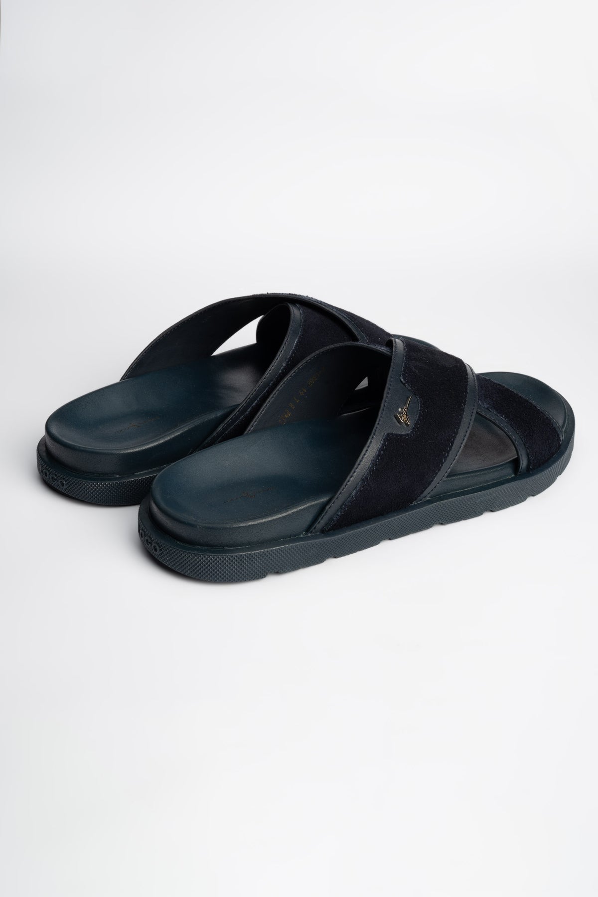 Built for durability and comfort, these blue slippers reflect a premium leather construction supported by a sturdy rubber sole for dependable everyday use.