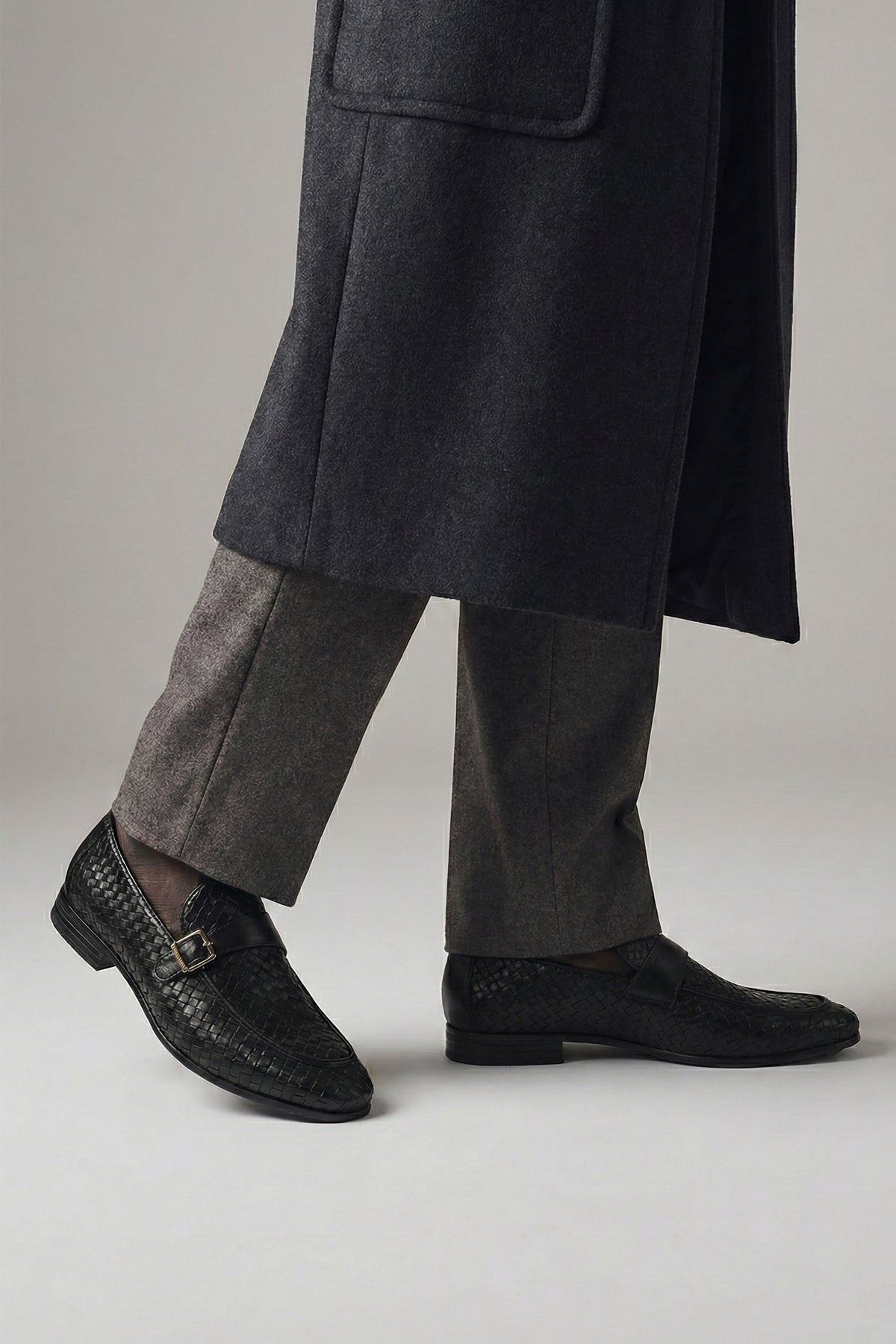 Style up with our interwoven black formal shoes, featuring a subtle finesse with a buckle on the side. These chic design blend elegance with class, perfect for making a statement while maintaining an air of elegance.