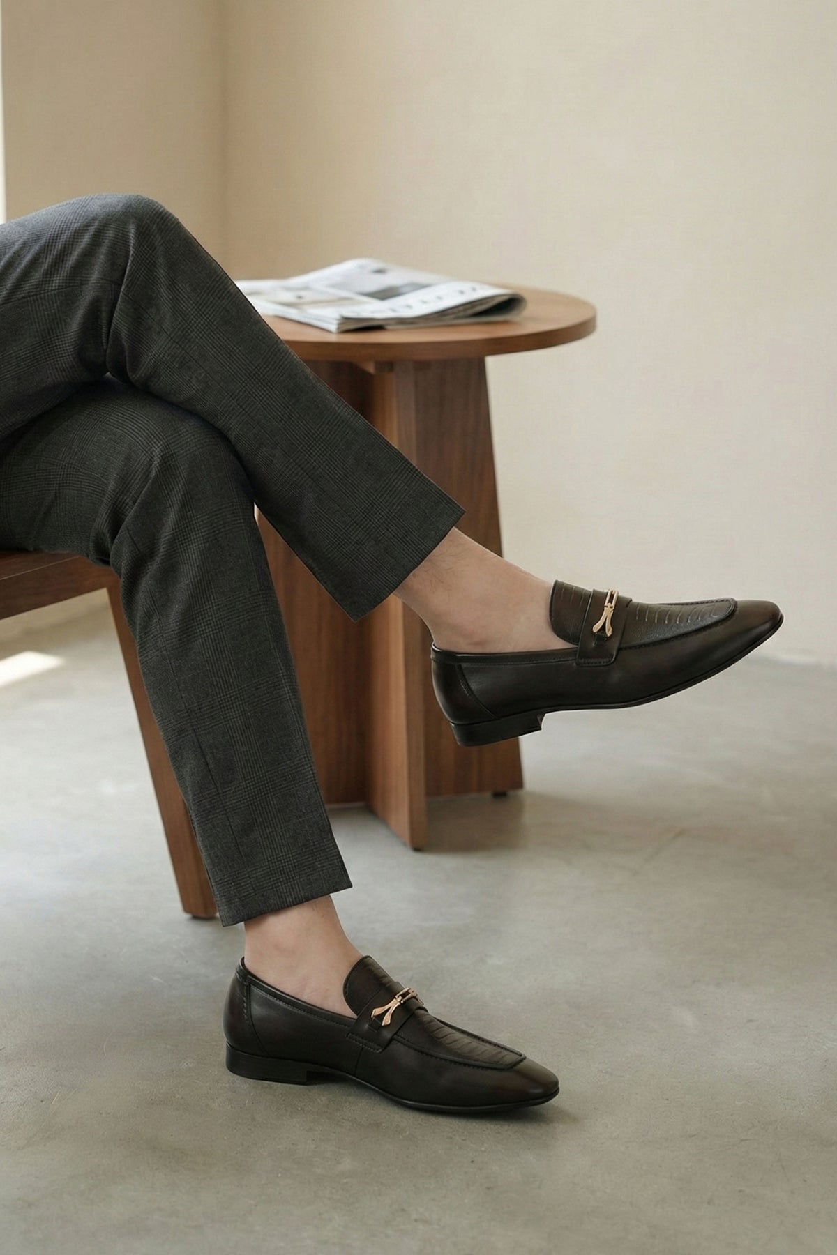 The dark brown multitextured design of these formal shoes is what sets them apart; the sleek golden brooch, on top gives chic and modern vibes.