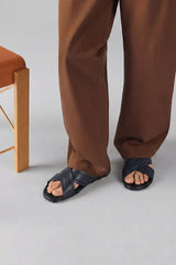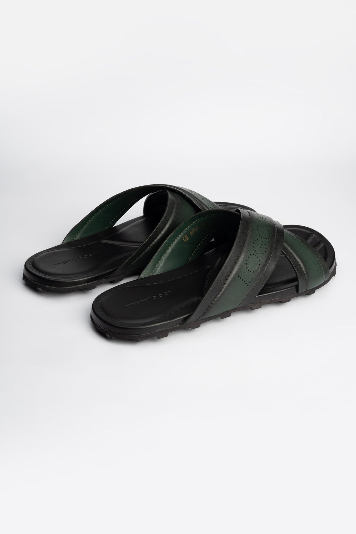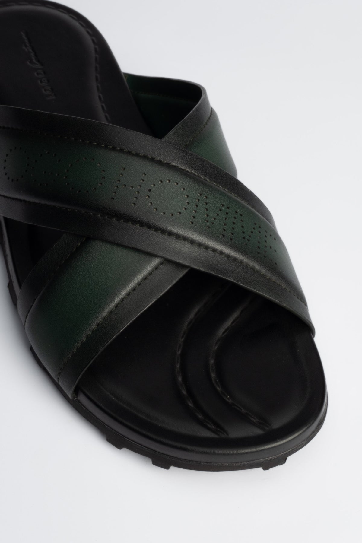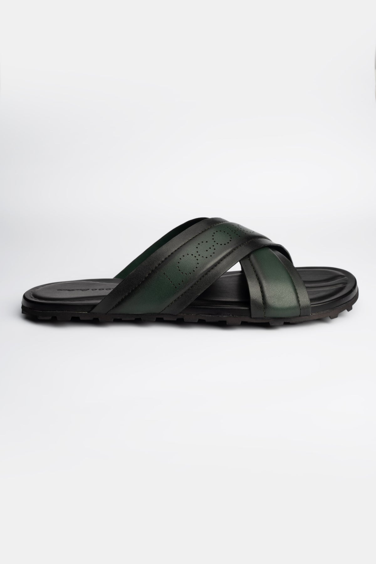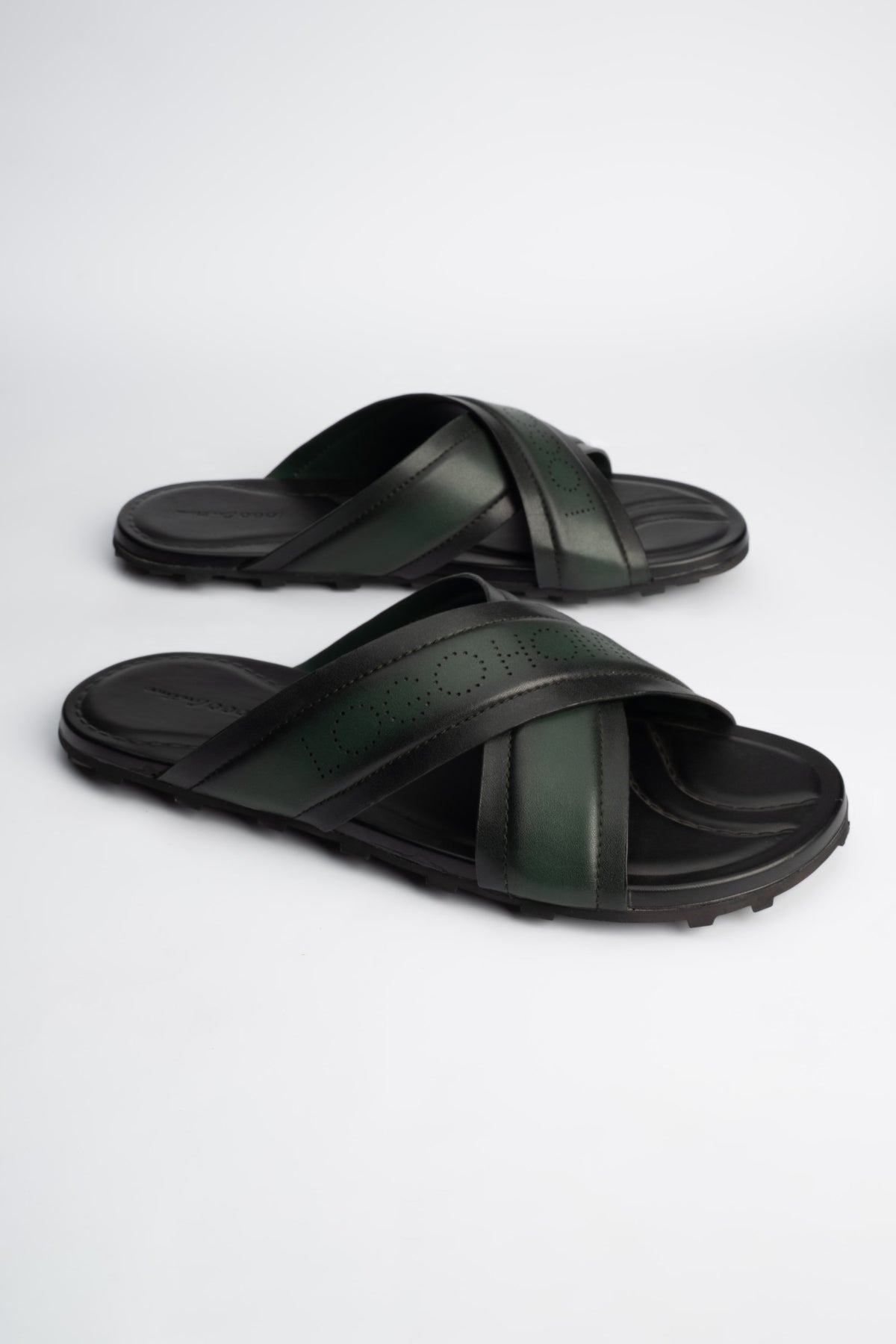 Stylish green cross cow leather slippers are crafted with a polished finish for modern appeal.