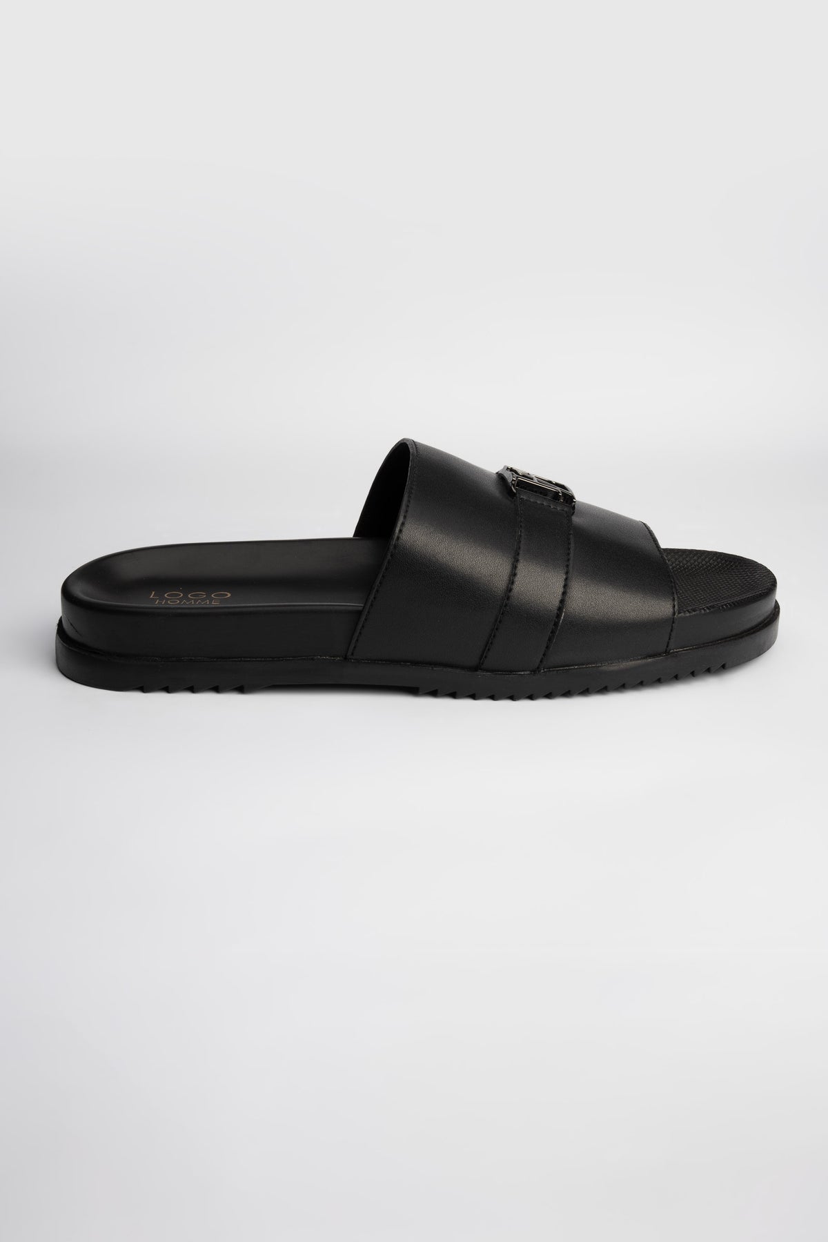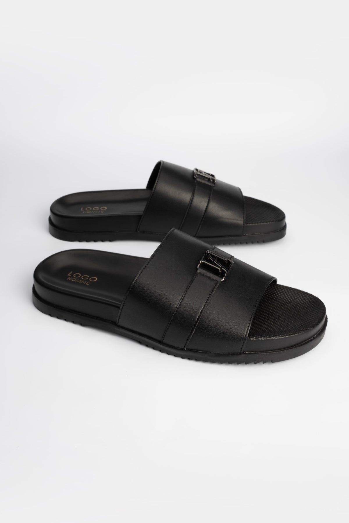 Minimalist style meets everyday comfort in these premium black slippers. They feature a sleek dual-strap silhouette with a metal buckle accent.