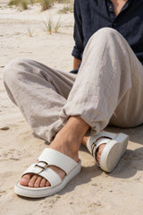 These elegant white slippers with a gold buckle on top are made with premium cow leather. This simple design is created for durability and timeless appeal.