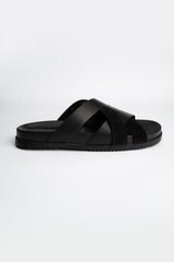 Classic style with rugged comfort, these black and brown strappy slippers feature a cow leather build and a reliable rubber sole.