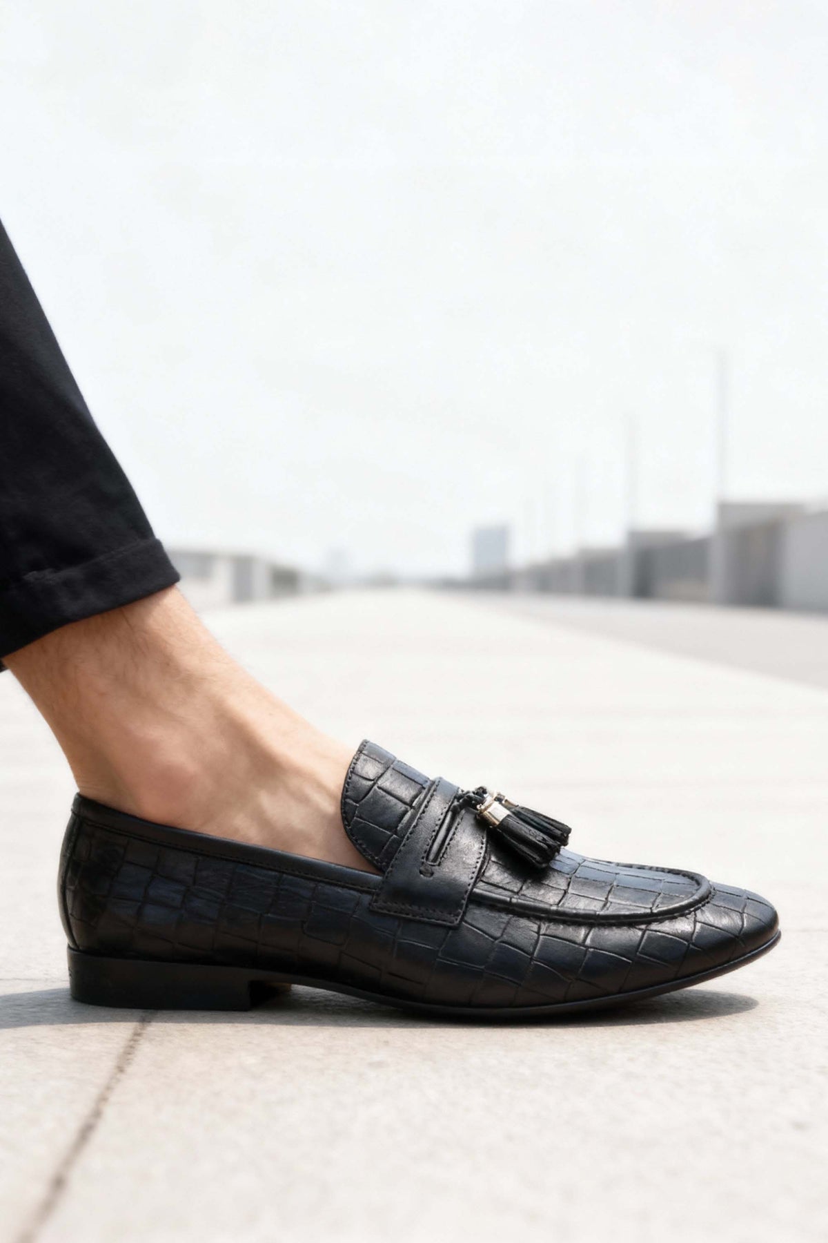 Uplift your look with these black croc-skin leather shoes, reflecting chic style. These formal shoes are finished with classic tassels on top for a refined touch of elegance.