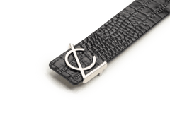 Black croc patterned leather belt with silver premium LOGO Collection buckle.