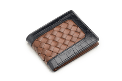 Brown interwoven leather wallet with croc pattern blue sides.