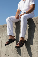 Classic style with rugged comfort, these black and brown strappy slippers feature a cow leather build and a reliable rubber sole.