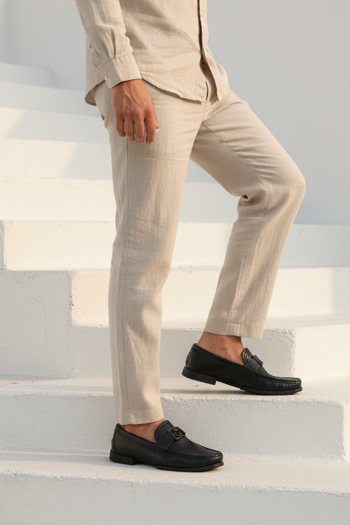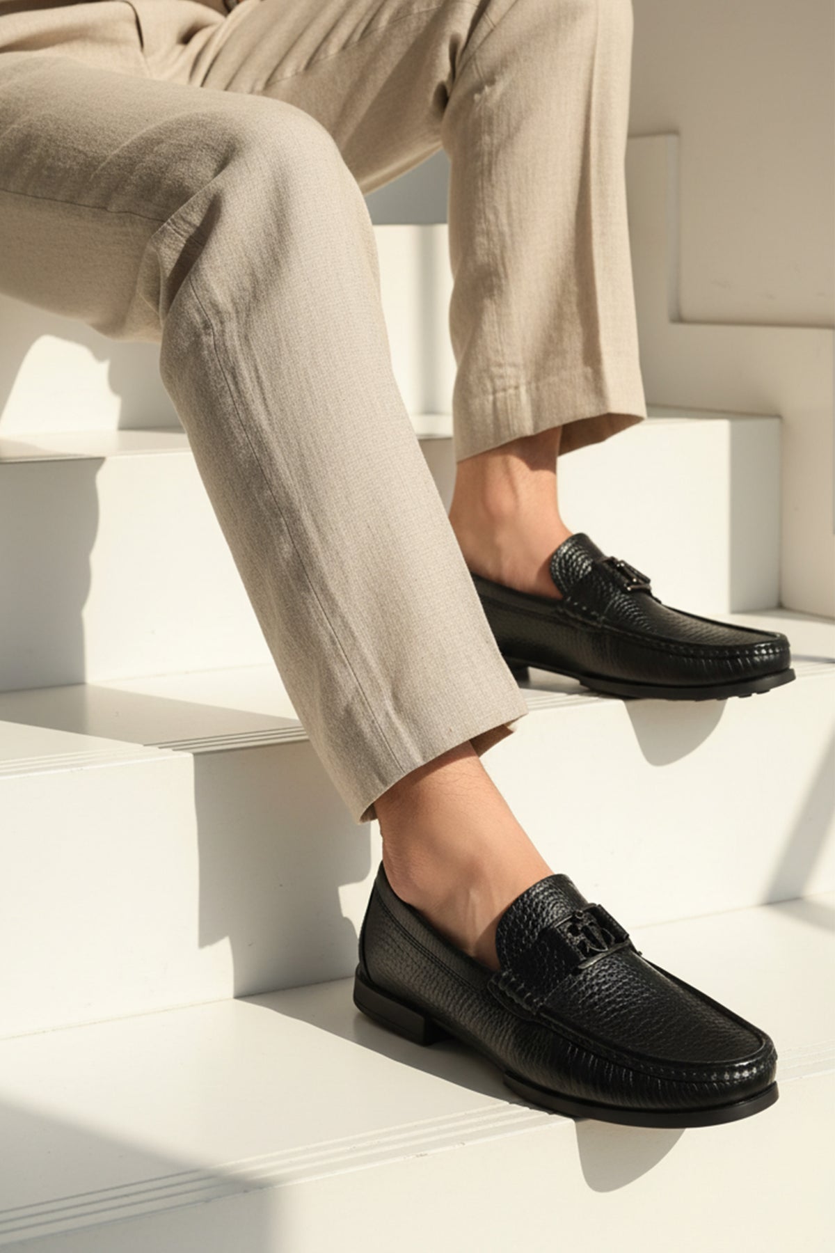 Smart and contemporary in design, these men’s loafers feature a textured black leather upper with a smart metal buckle detail on the front. They offer comfort and durability when paired with casual and semi-formal outfits.