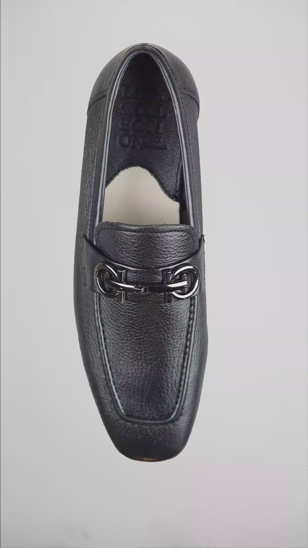Black loafers featuring a strong textured finish, defined by a metallic buckle