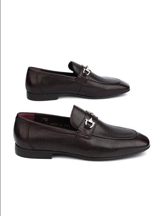 Add an elegant touch with this dark maroon formal footwear that features lizard-textured leather and a modern buckle accent.