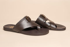 Gorgeous brown, shiny, cross-strapped slippers with a bright copper buckle and a toe-grip.